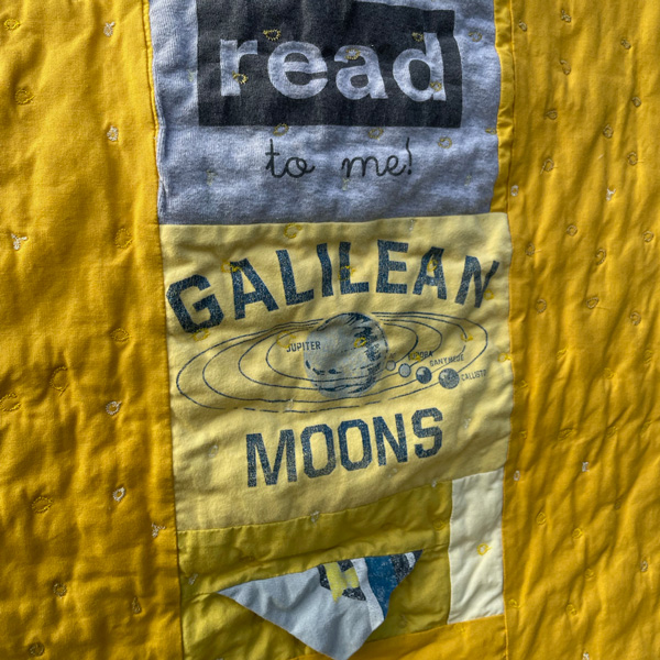 Beckett’s mom, Danica, commissioned this quilt to preserve his baby and toddler clothing. Beckett (almost a middle schooler when I started sewing) had very particular ideas about the size and shape of his quilt. He wanted a long skinny quilt to lie over the end of his mattress. It’s a really nice compromise between an art piece that lives on the wall and a blanket that rests on the bed. And it’s really hard to photograph!