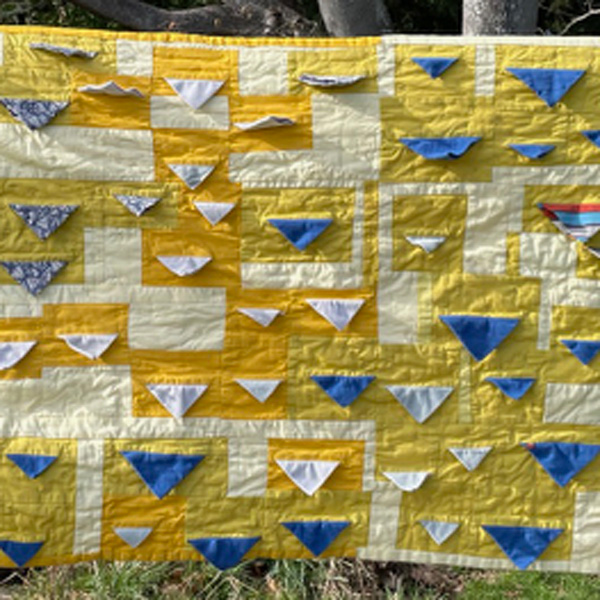 The flaps are ‘prairie points’ formed by folding a larger square into triangles. They’re scupltural and have a lot of movement and dimension. Even if you iron the points, they’re bound to flip upside down at some point. Then they’ll flip back. They’re funny. They’re adorable. They’re unpredictable and hard to control, so you just have to lean into it. Like raising a toddler.
