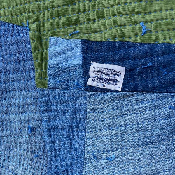 In the case of this quilt, I pulled out the jeans, cut  them, and sewed a quilt top. Then I got tired. I left the quilt top in a strange, irregular shape and shoved it into my Weirdo Box (where I let half-finished projects hibernate).
