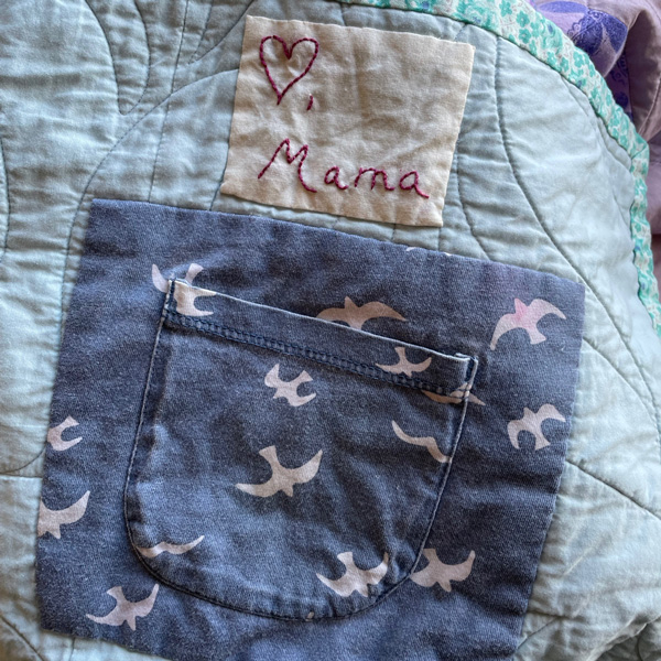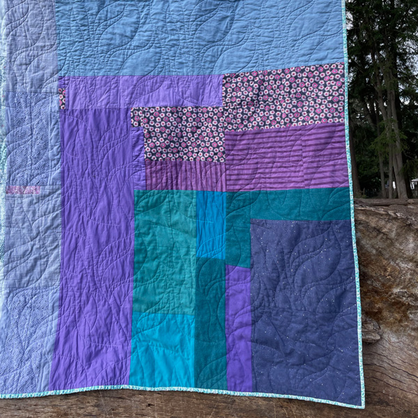 Apollo and my kid, Rowan, have pretty much been besties since birth. Apollo’s mom (and my friend) Danica commissioned this quilt. She visited our family with a large suitcase full of outgrown baby, toddler and elementary age clothing. We spent a sweet afternoon looking through a pile of Apollo’s clothing that was mostly blue and lavender. Danica kept saying “this color reminds me so much of little Apollo!”, so we decided to make a quilt that ‘felt’ like Danica’s memories.